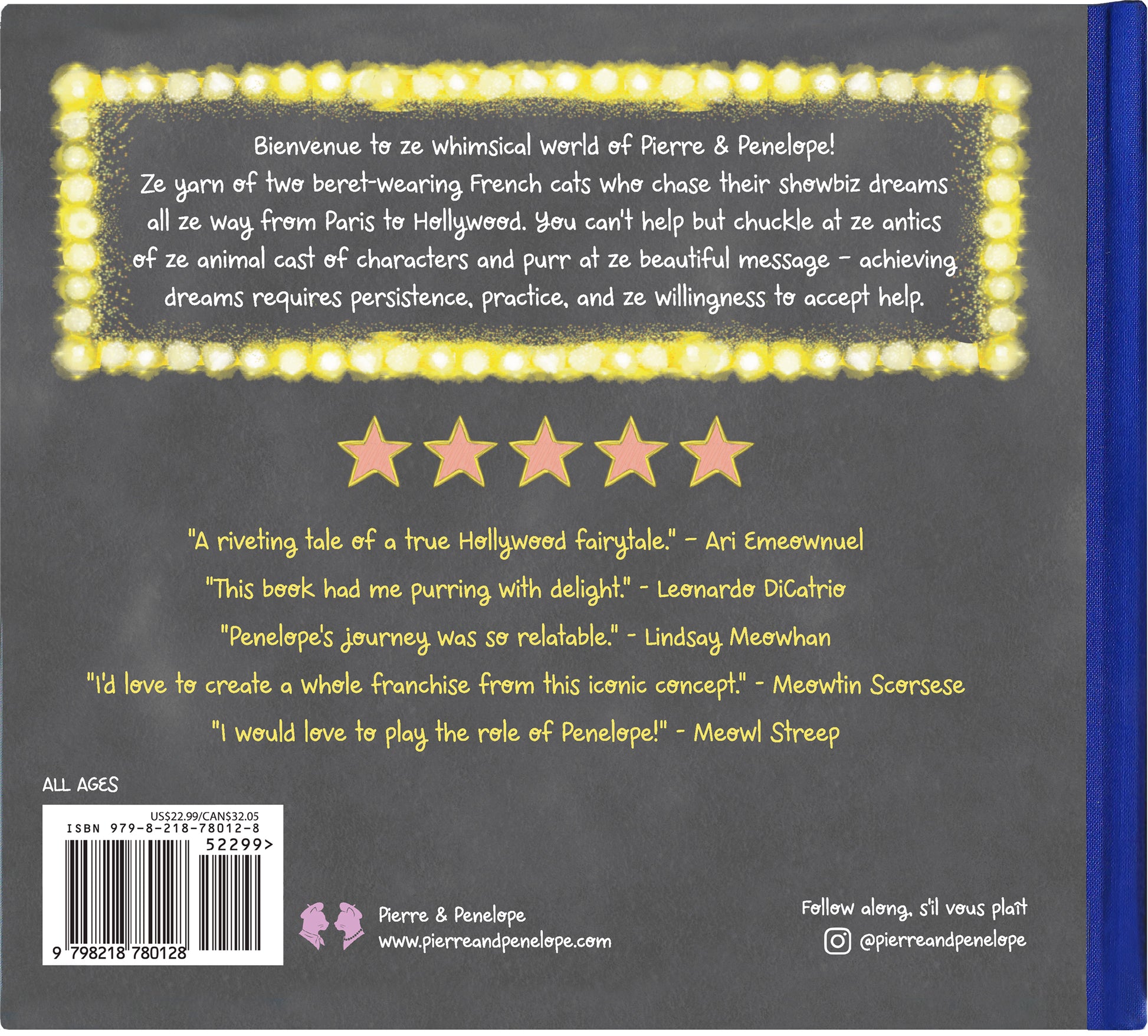 Ze heartwarming tale brings ze audience along as Penelope navigates ze competitive world of Tinseltown. Cleverly reimagined Hollywood institutions and landmarks will delight adult readers and ze industry elite, making it fun for all ages! You can’t help but chuckle at ze antics of ze animal cast and purr at ze beautiful message – achieving dreams requires persistence, practice, and ze willingness to accept help.